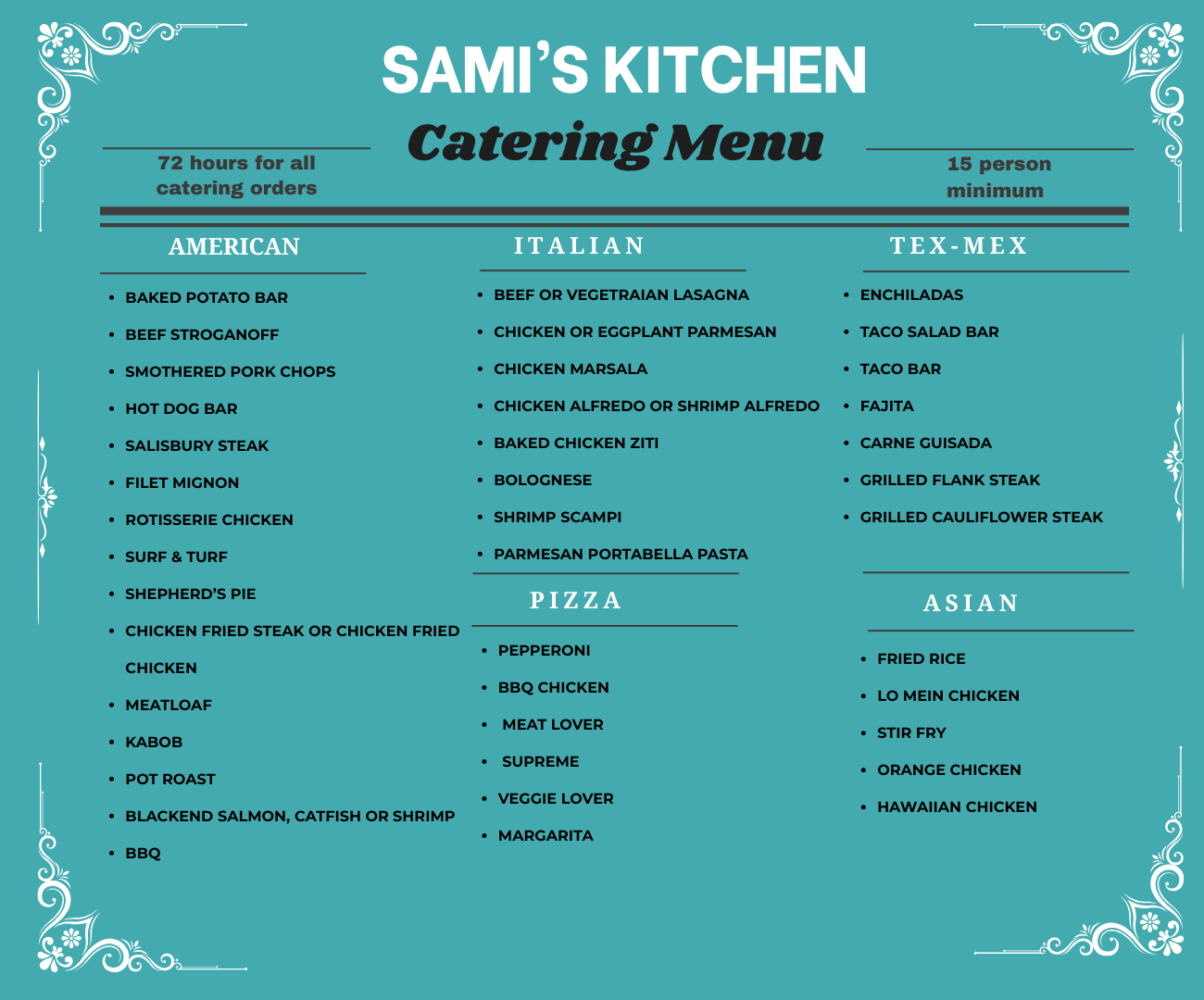 Our Box Lunch Options are crafted for every taste. Choose from the All-American, Greek, Tex-Mex, Burger, or Dieter’s Box Lunch, each including a gourmet main, fresh sides, a fruit cup, and soda or iced tea, with lighter options available for health-conscious guests.