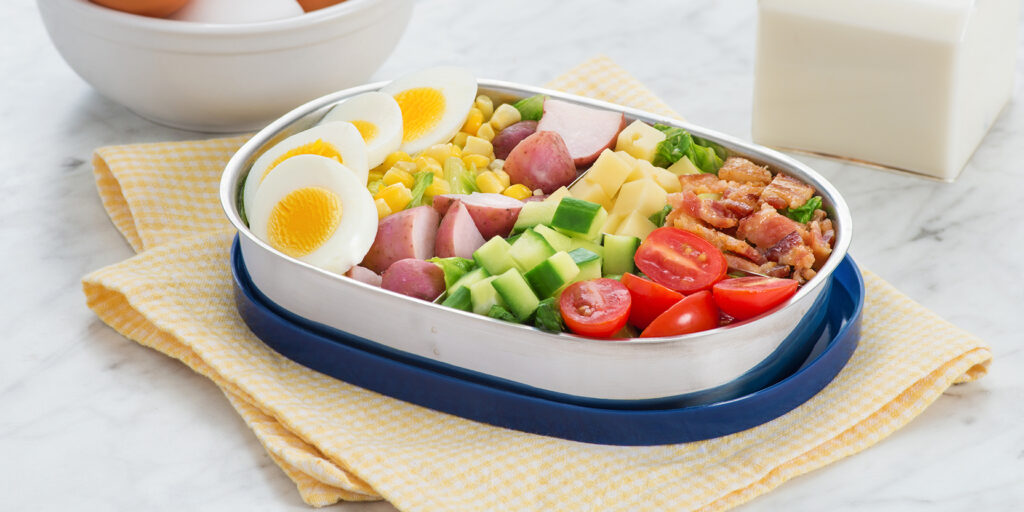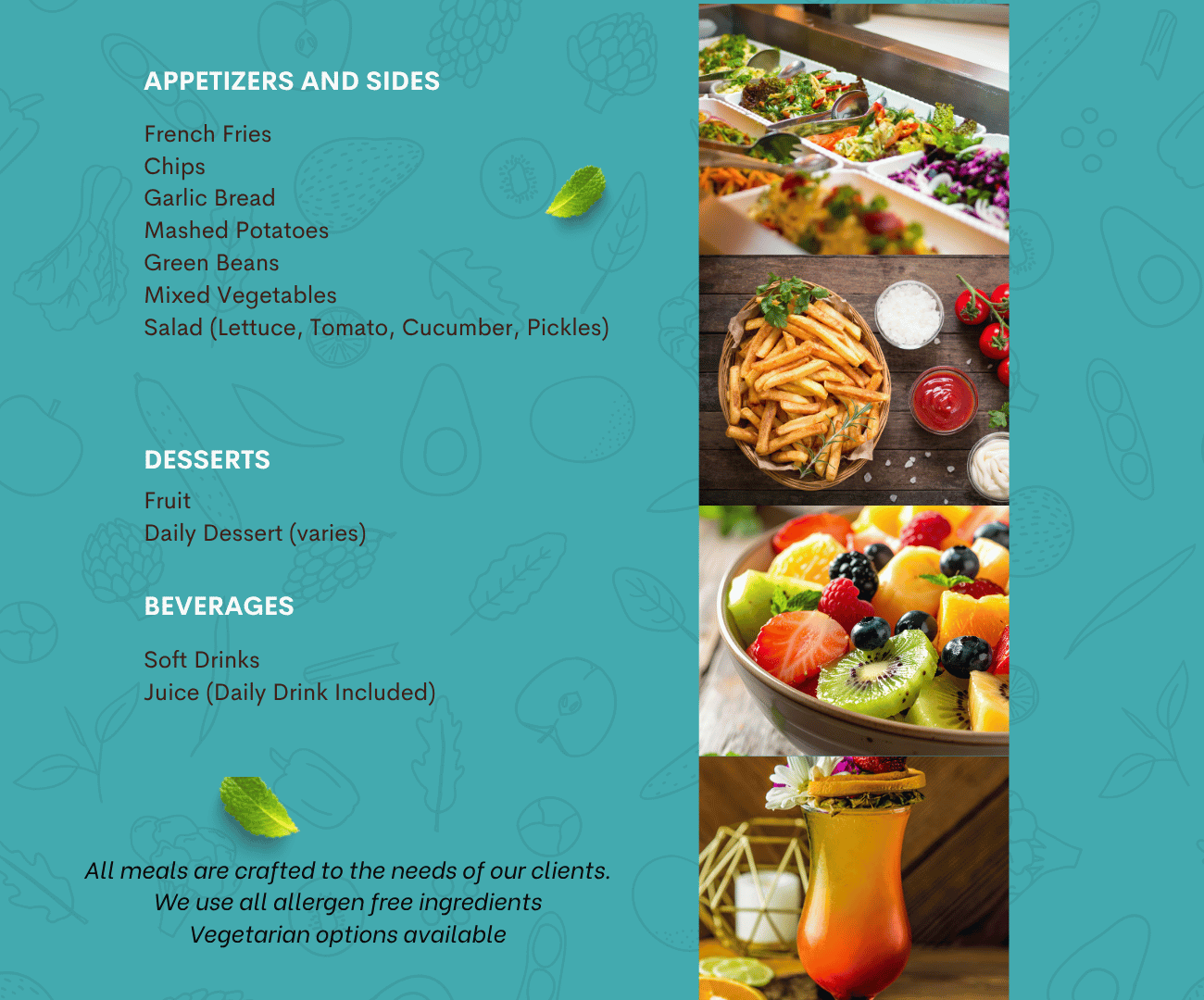 In the beverage section, guests can choose from refreshing milk or tangy orange juice. For a lighter option, a variety of fresh salads are available. The main offerings feature the savory Garden Chef Grill chicken.