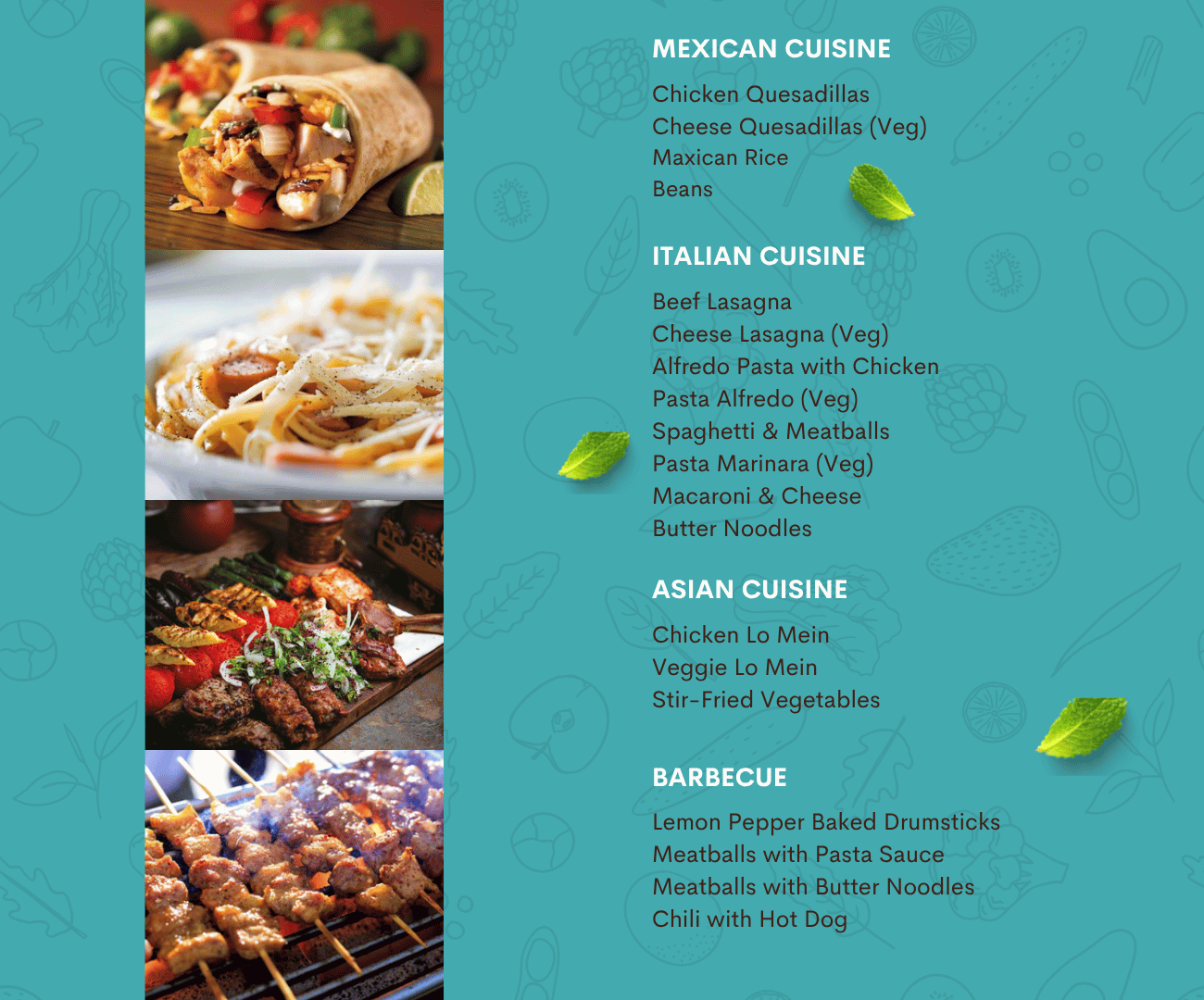 Our menu offers a wide variety of comfort foods and crowd favorites to suit every taste. Guests can enjoy creamy baked chicken, chicken nuggets or strips, chicken linguini or fettuccine Alfredo, BBQ chicken, beef brisket, and sausage links.